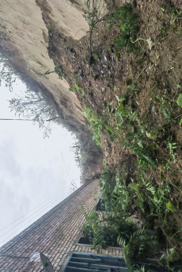 3.下罗侯村交通及住房双重隐患:村委对面道路旁石墙整体垮塌,已造成该路段交通中断,影响村民日常出行;同时垮塌石墙上方有3户村民住房,墙体垮塌后上方土体失去支撑,随时可能引发二次滑坡,危及住房安全。