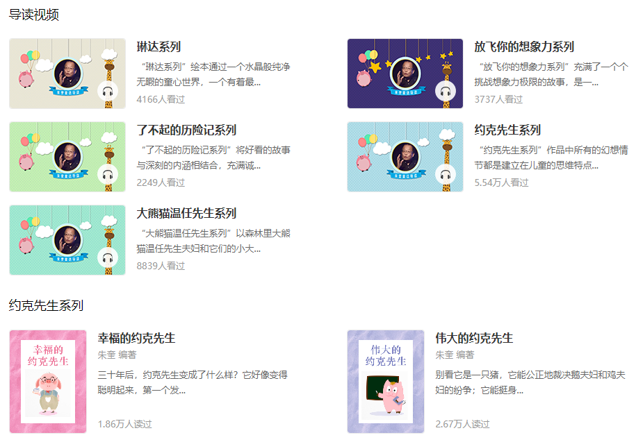 活动特推出朱奎先生的5个童话导读系列视频,包含“约克先生系列”、“琳达系列”、“大熊猫温任先生系列”、“了不起的历险记系列”及“放飞你的想象力系列”。