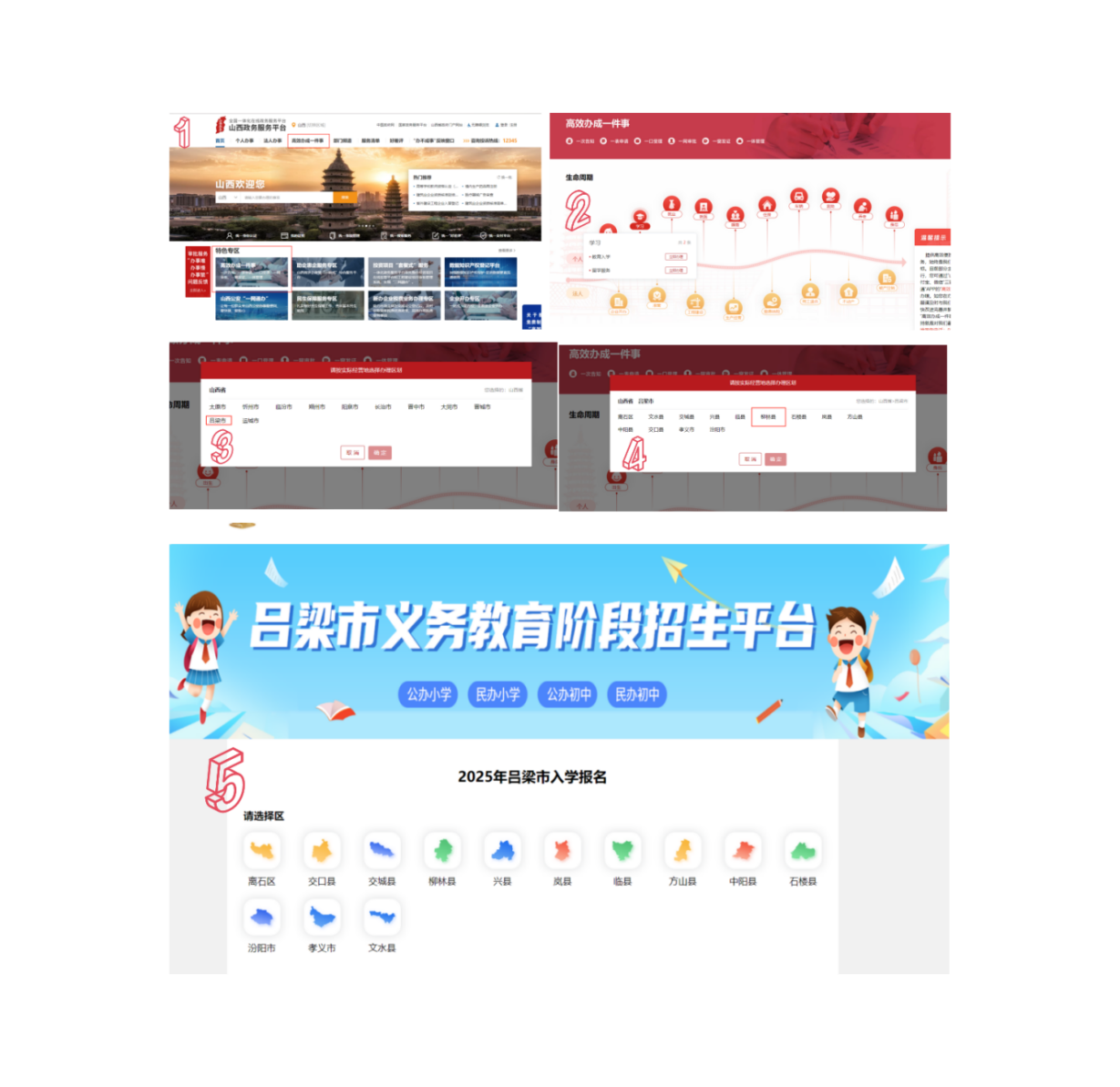 1、建立统一的招生管理平台。凡符合入学条件的适龄儿童少年,无论就读公办学校还是民办学校,均须在规定时间内登录山西省政务服务网,通过“吕梁市义务教育阶段招生平台”(具体报名流程参见附件6)完成入学信息登记,登记信息主要包括适龄儿童少年基本信息、监护人信息、家庭居住信息及房产信息等,自愿到民办学校入学就读的,登记信息时需明确选报民办意向。