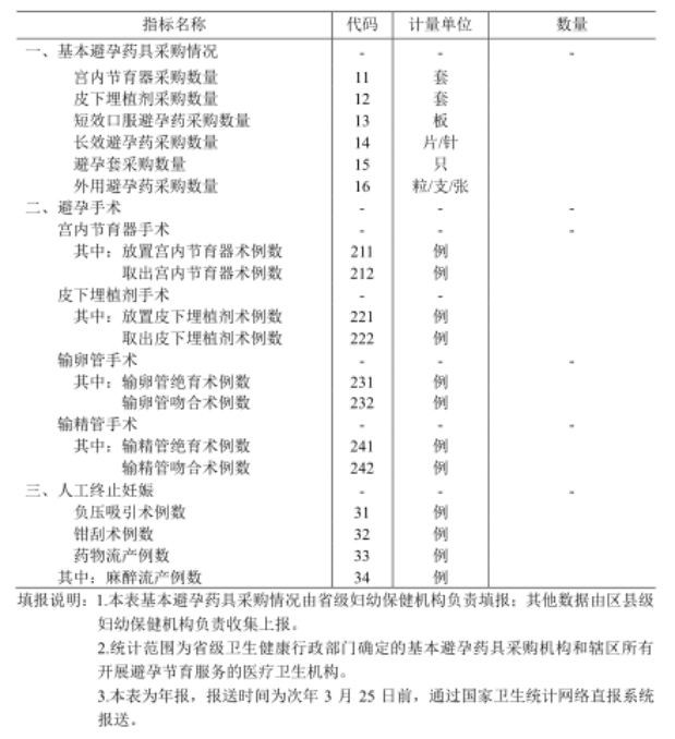 2 | 区域免费 基本避孕 药具发放 人(次)数 | 为当年辖区内基本避孕药具发放服务人次数和人数。 | 1、区域基本避孕药具发放人次数=本地区当年免费发放基本短效口服避孕药、长效口服避孕药、注射避孕针、外用避孕药、避孕套的发放人次数。2、区域免费基本避孕药具发放人数=本地区当年发放免费基本短效避孕药数量/12板+长效口服避孕药数量/12片+外用避孕药数量/100粒(支、张)+1个月避孕针数量/12针+3个月避孕针数量/4针+避孕套数量/100只。 |