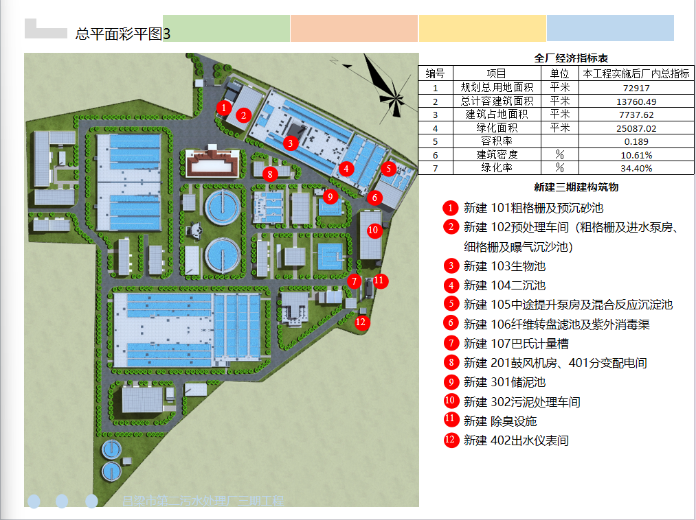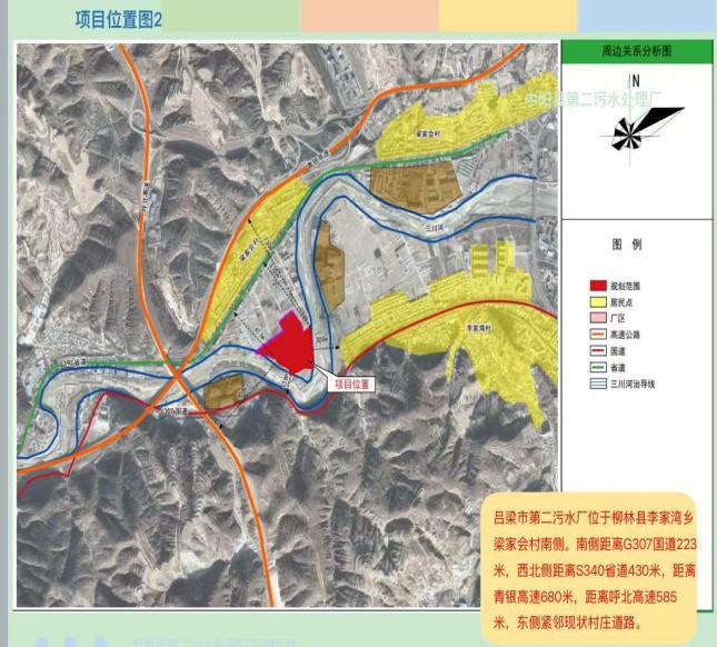 该项目位于柳林县李家湾乡梁家会村南侧,项目设计方案由天津市政工程设计研究总院有限公司完成设计。吕梁市第二污水处理厂三期工程为扩建工程,在现状污水厂基础上,于预留地内建设。污水厂现状总建筑面积为8948.22平方米。三期工程新增建总建筑面积为4100.94平方米,包括预处理车间、纤维转盘滤池及紫外消毒渠(上部建筑)、鼓风机房、分变配电间、污泥处理车间。根据《中华人民共和国城乡规划法》、山西省住房和城乡建设厅《关于城乡规划公开公示的实施办法》相关规定,现将区位图、总平面图、鸟瞰图予以公示。
