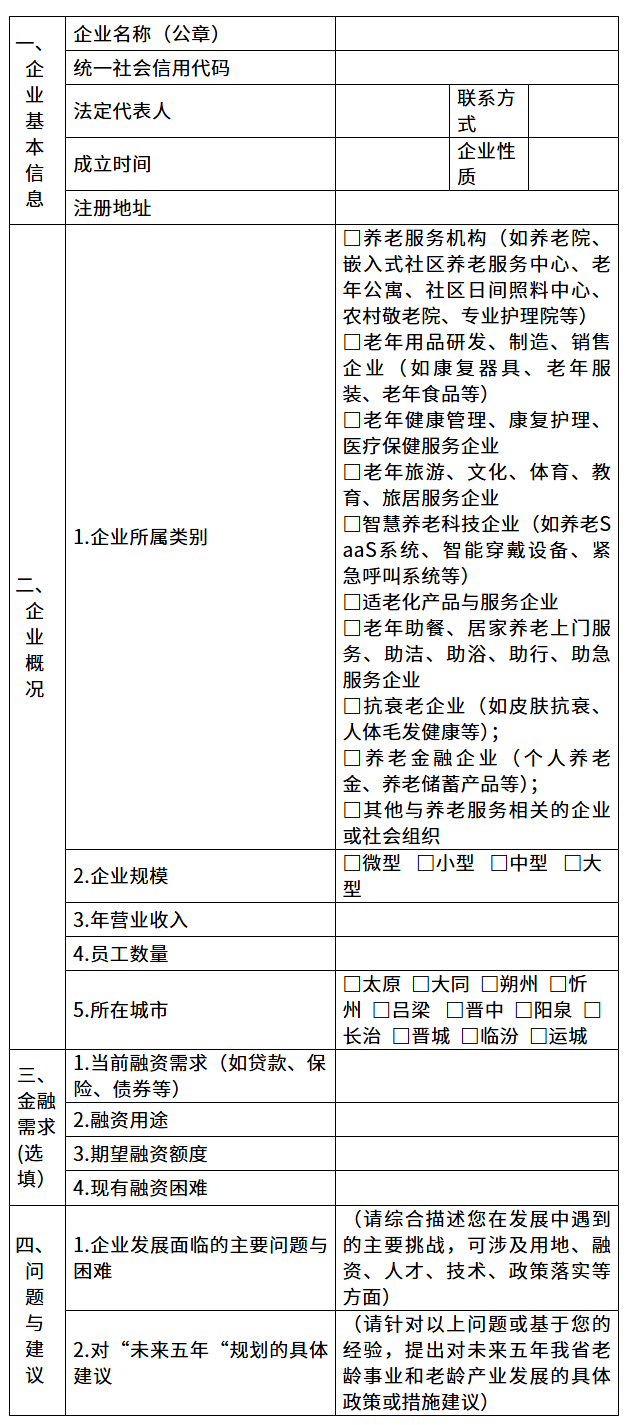 广泛吸纳涉老企业在经营实践、产业布局、创新发展中面临的困难与诉求,以及对未来五年老龄事业和产业发展的意见建议,为山西省制定完善银发经济相关扶持政策、优化产业服务体系、搭建供需对接平台提供重要参考。