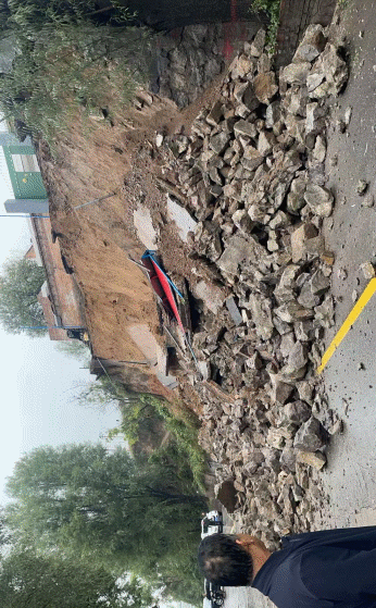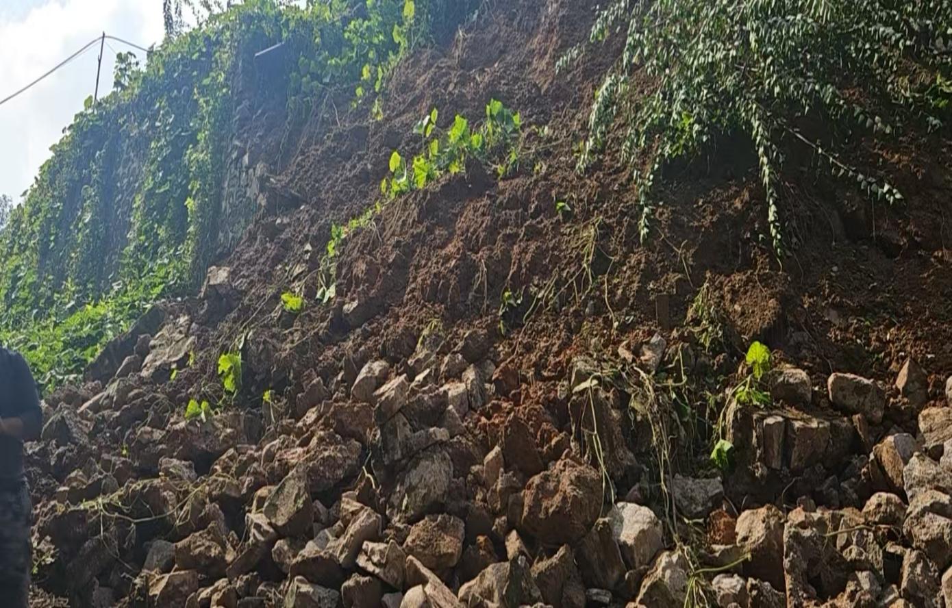 3.下罗侯村交通及住房双重隐患:村委对面道路旁石墙整体垮塌,已造成该路段交通中断,影响村民日常出行;同时垮塌石墙上方有3户村民住房,墙体垮塌后上方土体失去支撑,随时可能引发二次滑坡,危及住房安全。