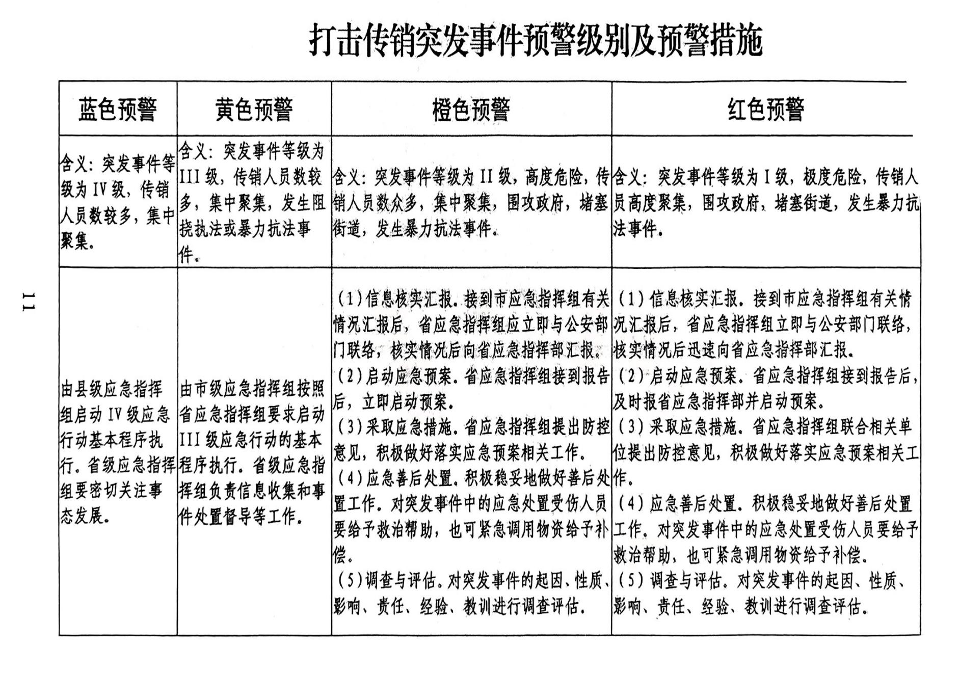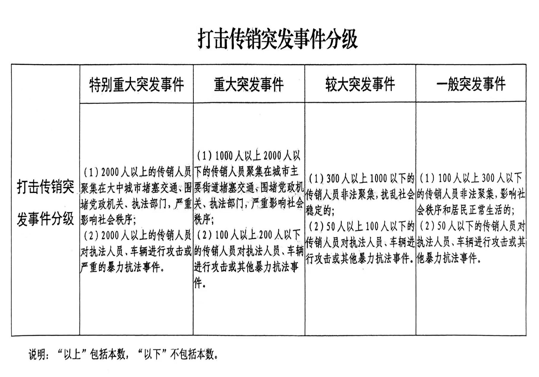 打击传销突发事件从低到高分为四级,即Ⅳ级(一般)、Ⅲ 级(较大)、Ⅱ级(重大)、I级(特别重大),依次用蓝色、黄色、橙色、红色表示。Ⅳ级以下情形的突发事件不列入分级。