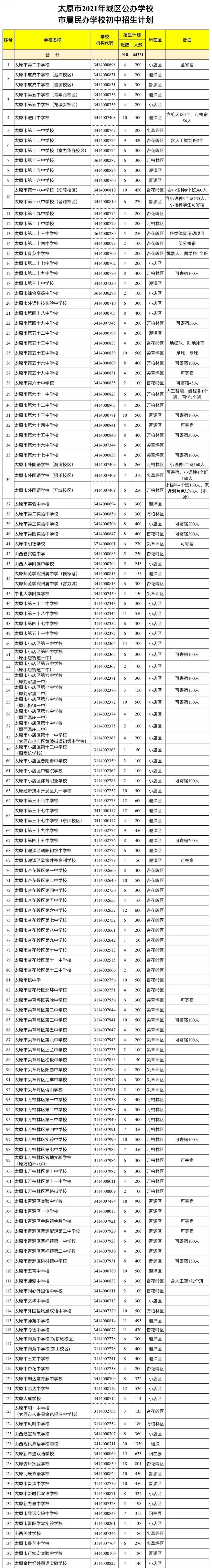 7月16日,太原市教育局印发了《关于下达2021年城区公办学校和市属民办学校义务教育阶段招生计划的通知》(以下简称《通知》),《通知》指出各城区教育局,省属学校,市属公办、民办学校要根据《中华人民共和国义务教育法》《太原市教育局关于做好2021年普通中小学招生入学工作的通知》(并教基〔2021〕4 号)的要求,切实保障太原市适龄儿童接受义务教育的权利。太原市教育局结合实际情况,制定太原市2021年城区公办学校、市属民办学校义务教育阶段招生计划。