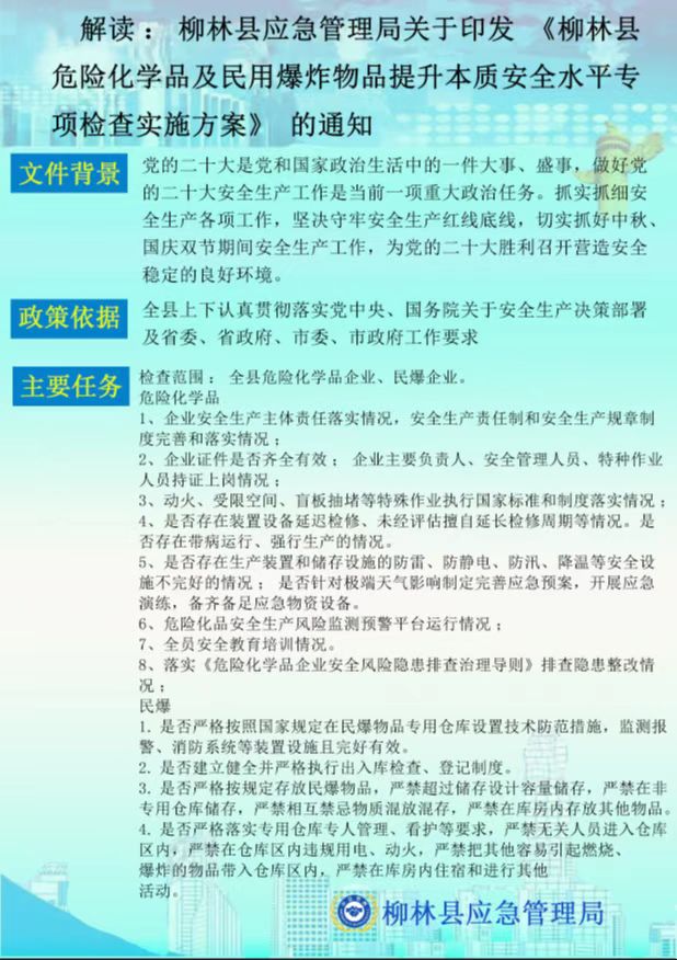 图解:应急管理局关于柳林县危险化学品及民用爆炸物品提升本质安全水平专项检查实施方案的解读