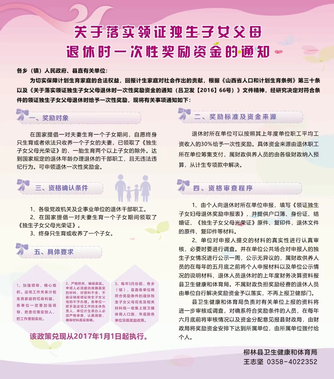 【图解】柳林县人民政府办公室落实领证独生子女父母退休时一次性奖励资金的解读