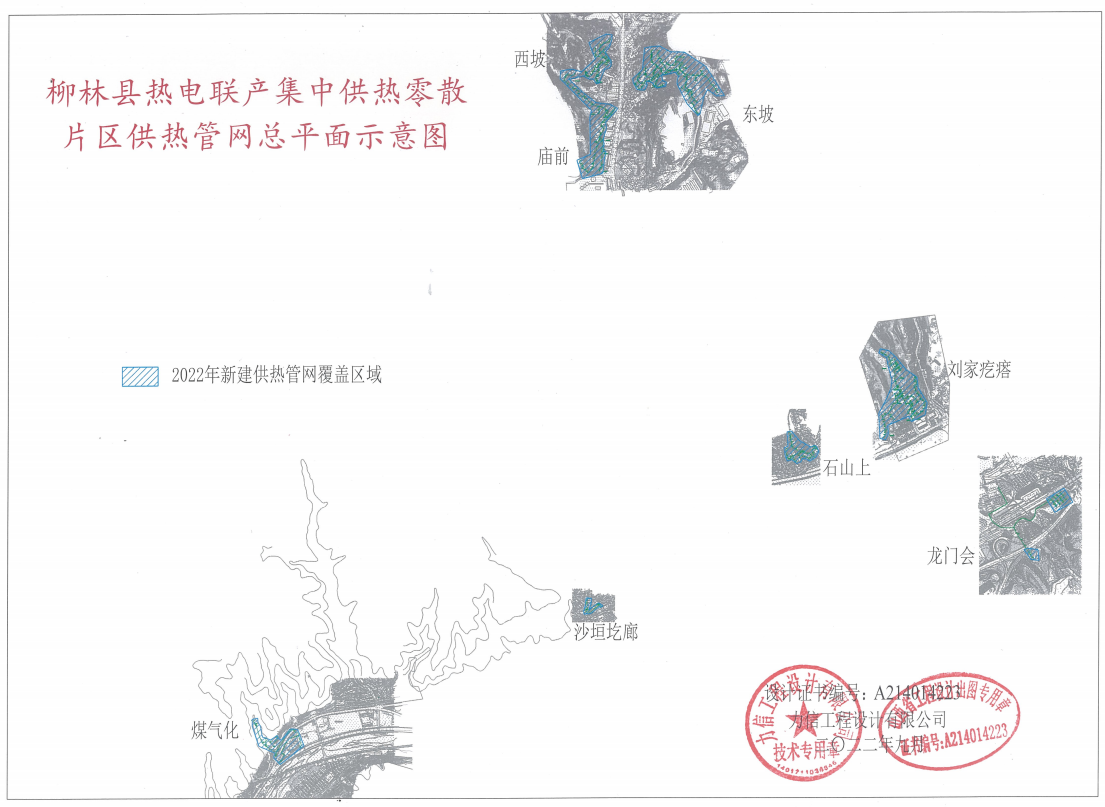 该项目包括柳林县柳林镇薛家湾石山上、薛家湾刘家圪垯、屈家沟东坡、屈家沟西坡、屈家沟庙前、庙湾煤气化对面、龙门会、沙垣圪廊集中供热管网二次管网、二次加压站10座和入户装置。主要建筑内容为:管线长度25.124km,最大管径DN300,架空敷设24.195km,直埋敷设0.929km。