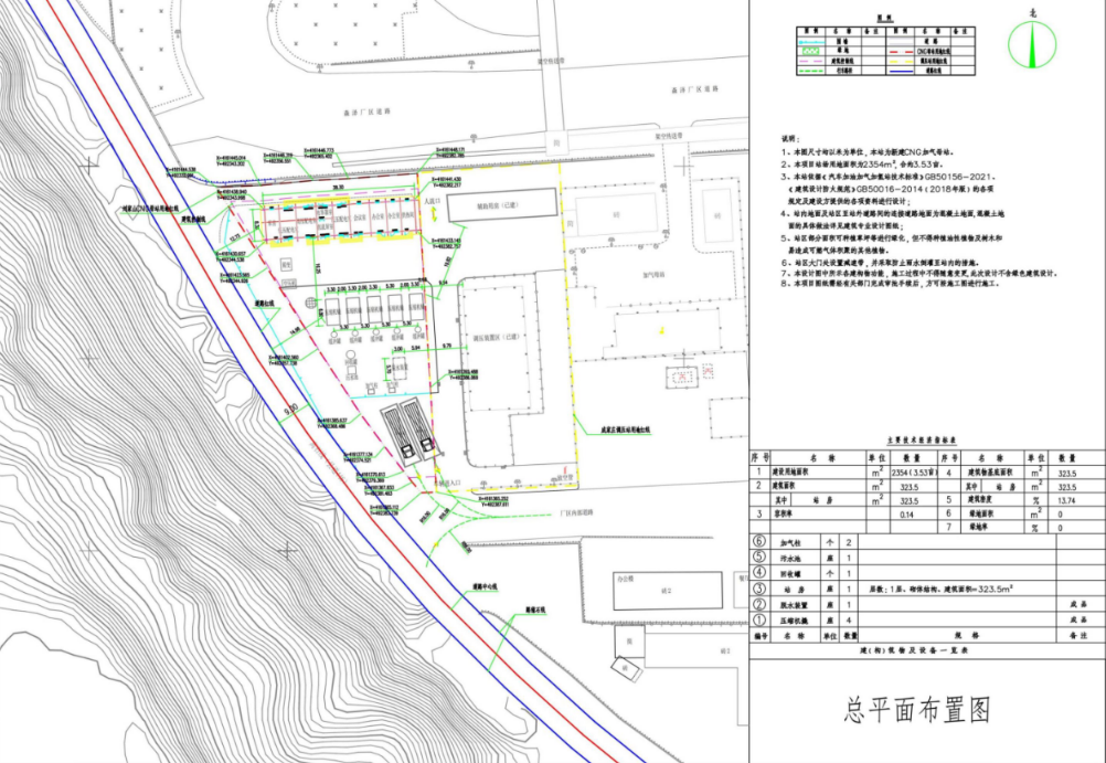 本项目用地面积2354m2,总建筑面积323.5m2。本站为CNG加气母站。主要建设内容包括:一层砌体站房一座,建筑面积323.5m2;工艺装置区设置5台压缩机,1台脱水装置、2台加气柱及相关配套设施设备。